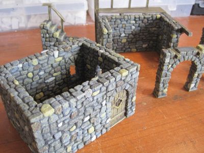 Sotto tutti i pezzi del Kit. Notare che ho tenuto il tutto assolutamente separato per poter sfruttare al massimo la modularità del Kit anche se, col senno di poi, ho visto che si potrebbe anche evitare la cosa e unire almeno i 2 locali in pietra, magari applicando un pavimento sotto ( come indicano i suggerimenti della Castle Art's ).